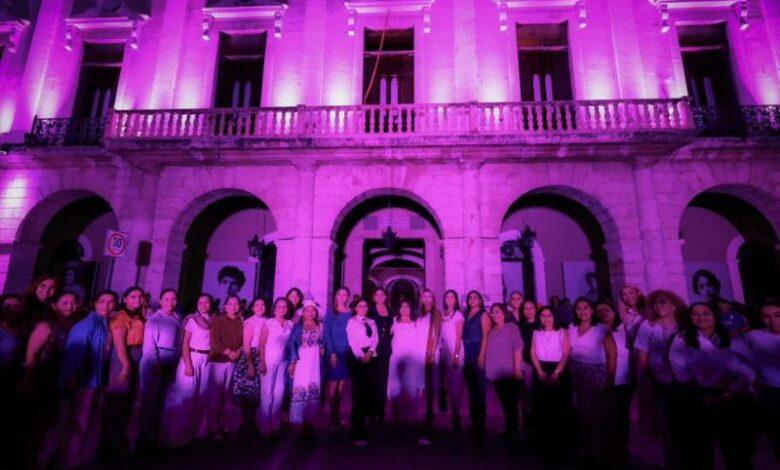 El gobernador Joaquín Díaz Mena encabezó el encendido en color morado del Palacio de Gobierno por el Día Internacional de la Mujer (8M) en Yucatán.