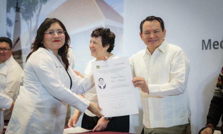 El Gobernador Joaquín Díaz Mena y la directora general de las Universidades para el Bienestar Benito Juárez García**, Raquel Sosa Elízaga, encabezaron la entrega de 95 títulos en Medicina Integral y Salud Comunitaria.