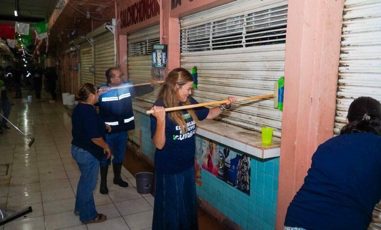 La alcaldesa Cecilia Patrón Laviada encabezó una jornada de limpieza profunda en el Mercado Lucas de Gálvez, uno de los puntos más emblemáticos de la economía local de Mérida.