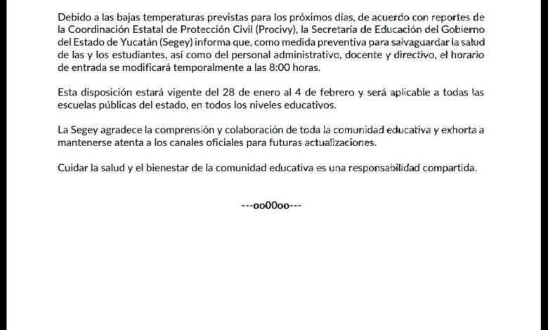 Ante el descenso de temperaturas previsto por la Coordinación Estatal de Protección Civil, la Secretaría de Educación del Gobierno del Estado de Yucatán anunció que, de manera preventiva, el horario de entrada en todas las escuelas públicas del estado se recorrerá a las 8:00 horas. La medida aplicará del 28 de enero al 4 de febrero en todos los niveles educativos, con el objetivo de proteger la salud de estudiantes y personal educativo.