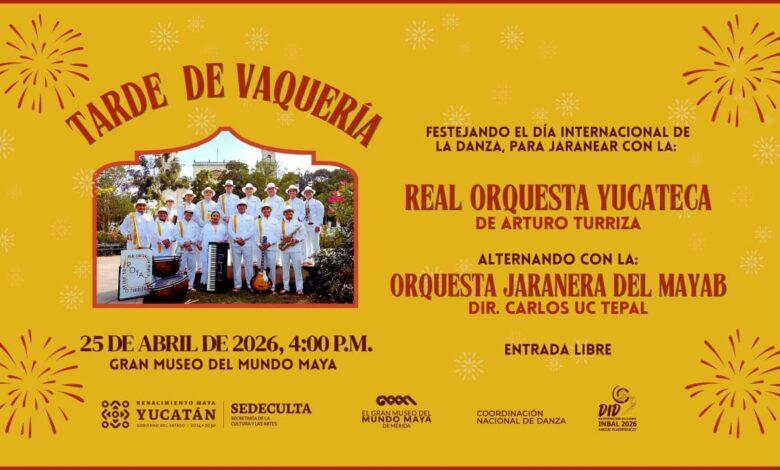 El Gran Museo del Mundo Maya será sede de una Tarde de Vaquería el próximo 25 de abril, evento organizado por la Secretaría de la Cultura y las Artes (Sedeculta) para conmemorar el Día Internacional de la Danza con acceso gratuito para todo público.