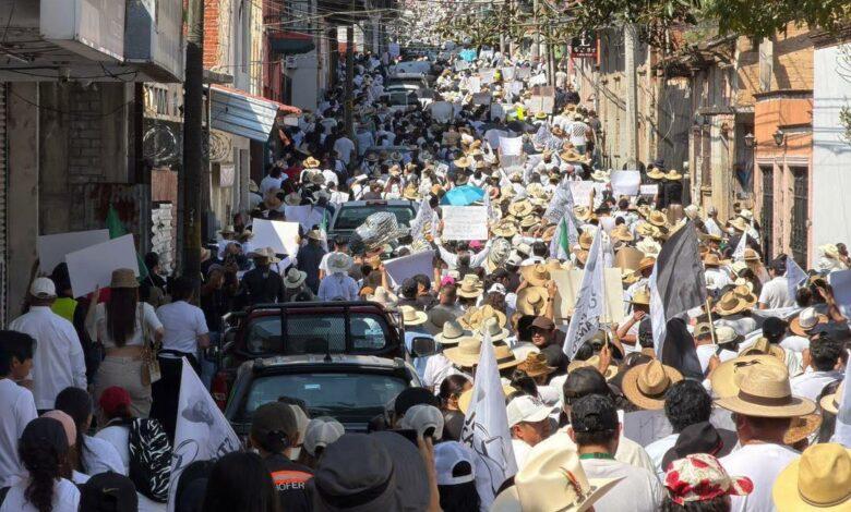 Los manifestantes vestían de blanco o negro, portaban sombreros y pancartas con consignas como: “Él no murió, el Estado lo mató”, “Carlos Manzo vive, la lucha sigue”.