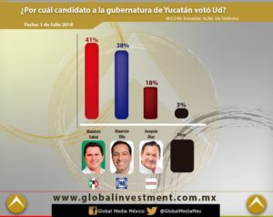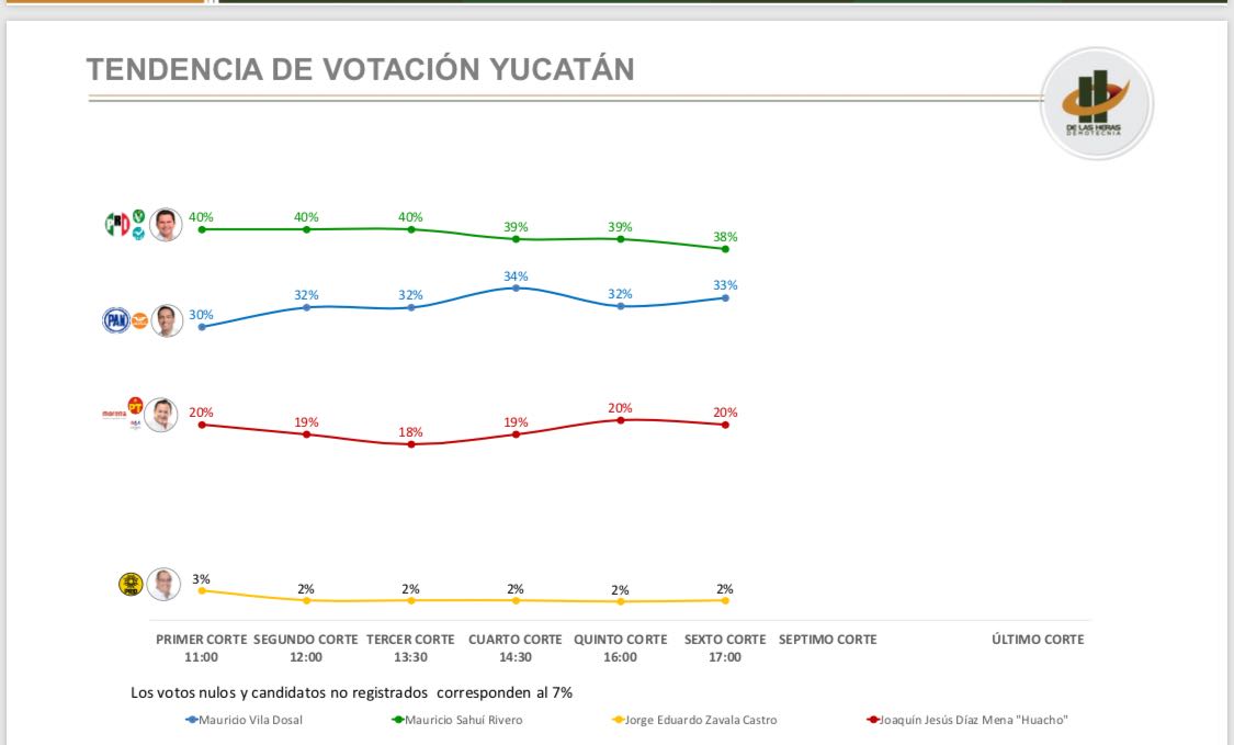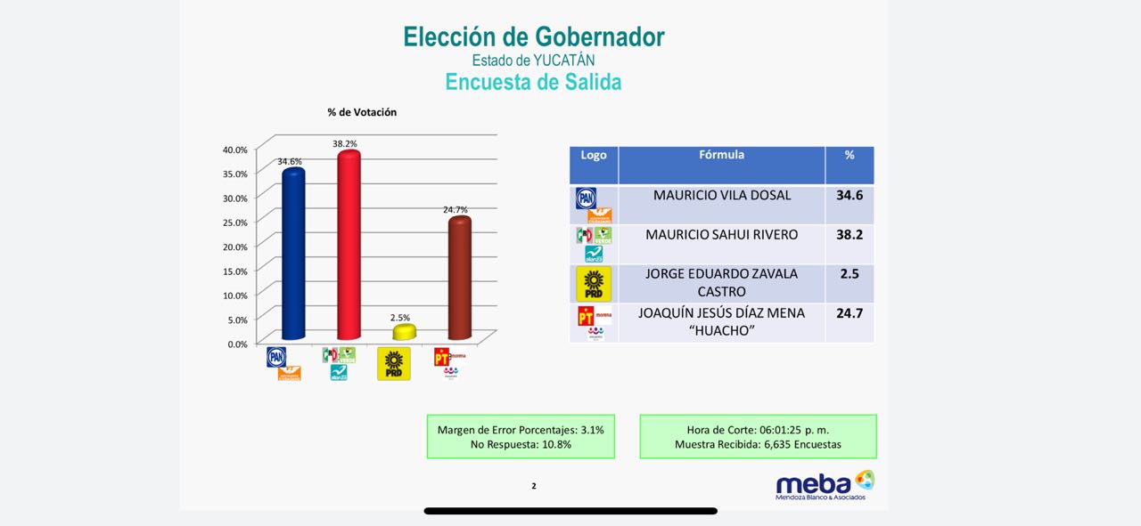 Al presentarse las gráficas, la empresa Meba detalló que Mauricio Sahuí registra un 38.2 por ciento y Mauricio Vila del PAN y Movimiento Ciudadano 34.6 por ciento. De Las Heras le da 38 puntos al tricolor y 33 al ex alcalde. La encuesta de Global Media pone al ex Secretario de Desarrollo Social con 41 por ciento y al segundo lugar con 38 por ciento.