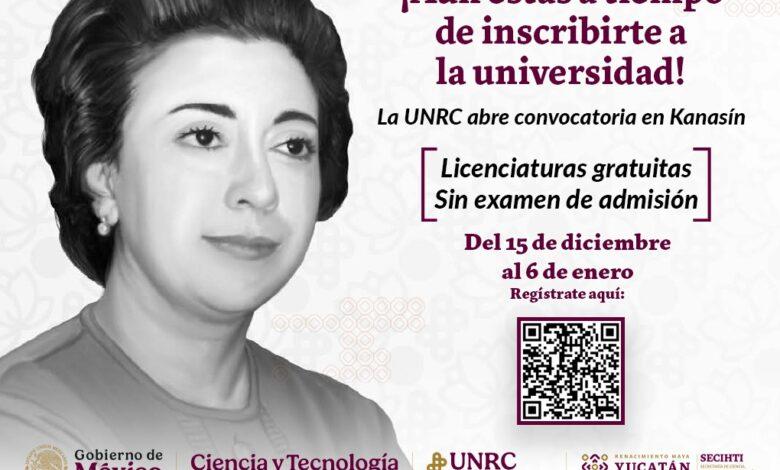 El Gobierno del Estado informó que continúa abierta la convocatoria de ingreso a la Universidad Nacional Rosario Castellanos (UNRC), Unidad Kanasín, con registro disponible hasta el 6 de enero de 2026. La institución ofrece educación superior gratuita, sin examen de admisión y en modalidad híbrida, dirigida a personas que concluyeron o están por concluir el bachillerato.