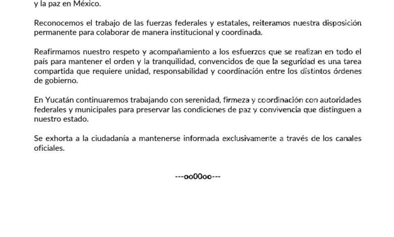 El Gobierno del Estado de Yucatán manifestó su solidaridad con la presidenta Claudia Sheinbaum Pardo y respaldó la política nacional enfocada en fortalecer el Estado de Derecho y la paz en México. Reconoció el trabajo de las fuerzas federales y estatales, reiteró su disposición para colaborar de manera coordinada y subrayó que la seguridad es una responsabilidad compartida entre los distintos niveles de gobierno. Asimismo, aseguró que en Yucatán se continuará trabajando en coordinación con autoridades federales y municipales para preservar la paz, e invitó a la ciudadanía a informarse únicamente a través de canales oficiales.
